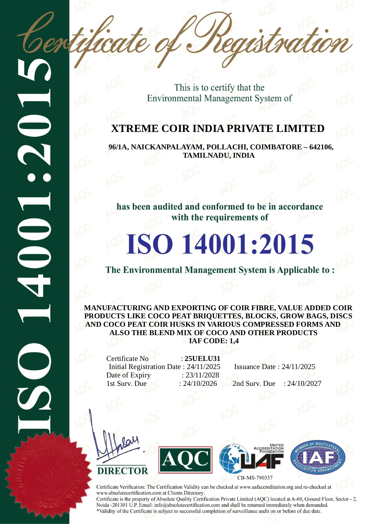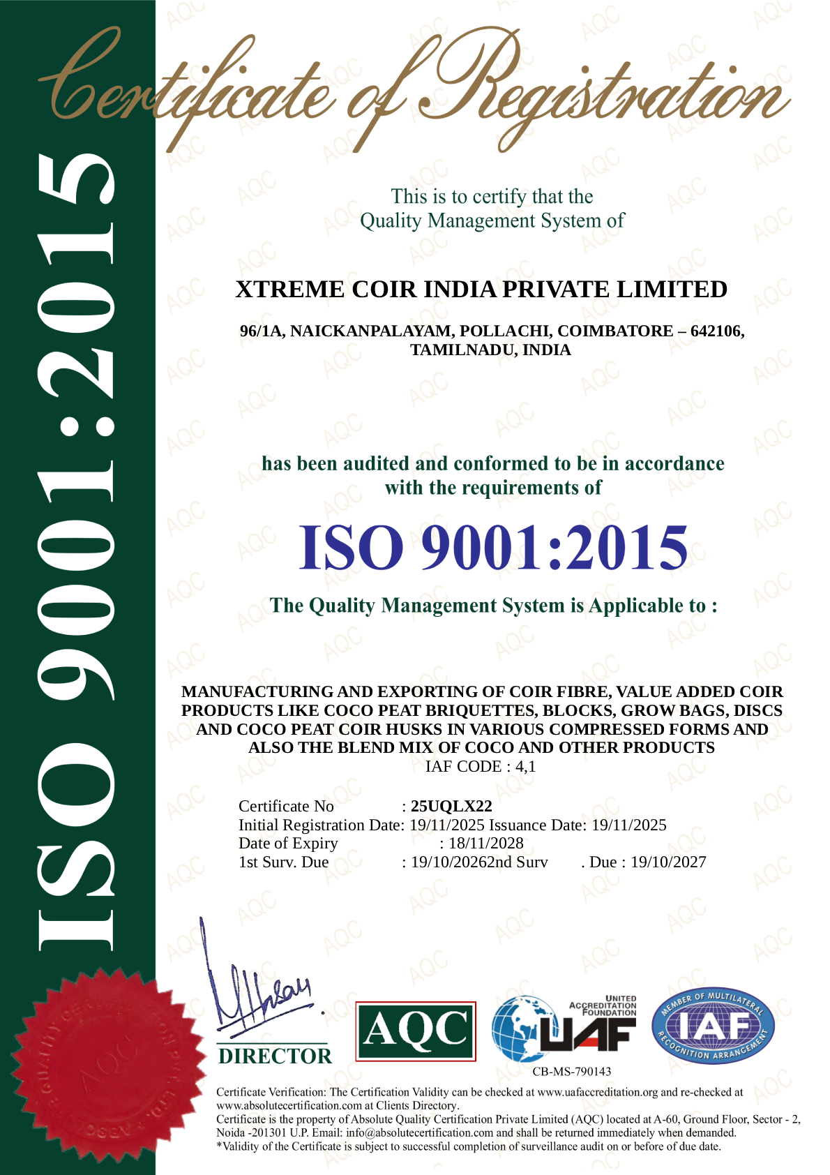 At XTREME COIR INDIA PRIVATE LIMITED, quality, consistency and environmental responsibility are the foundation of everything we do. Our systems are audited and certified as per internationally recognized standards to ensure world-class manufacturing and export practices.